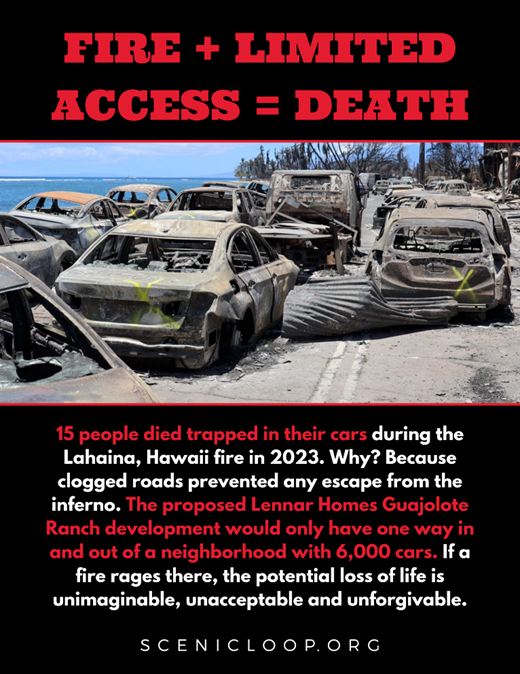 April 21, 2026 – As it stands, there would be only one way in and one way out of the proposed Guajolote Ranch development of Florida-based Lennar Corp., funneling an additional 30,000 vehicle trips a day onto two-lane Scenic Loop Road and creating a massive wildfire evacuation and emergency response hazard.